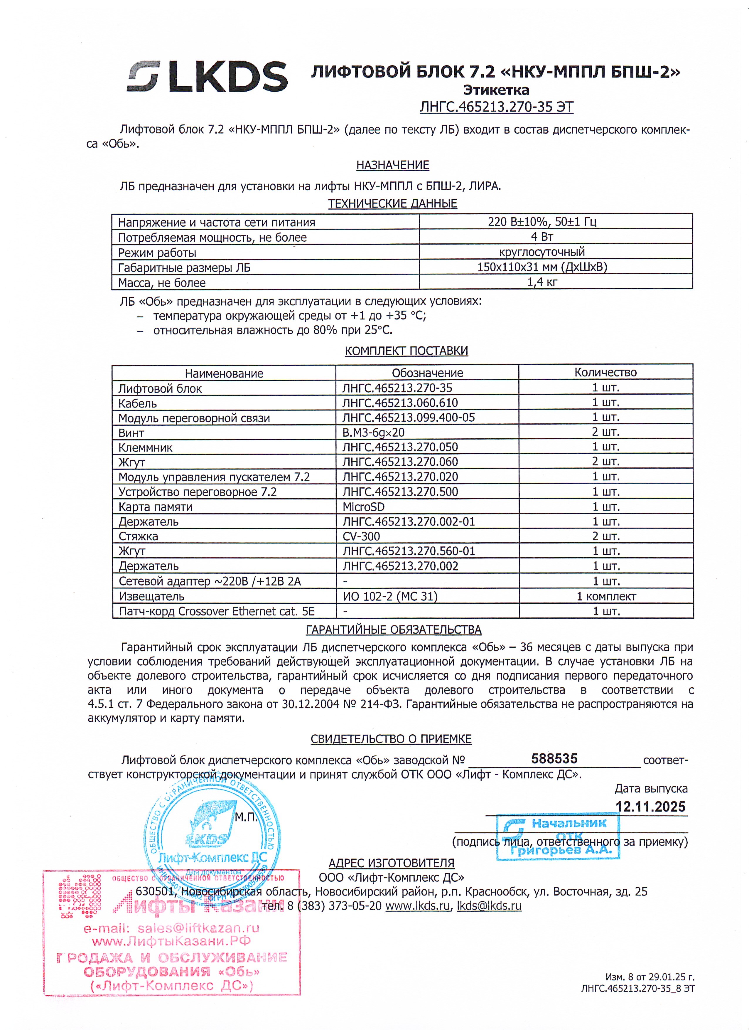 - подаёт сигнал при обнаружении неисправностей и возникновении опасных ситуаций, поскольку такая функция также предусмотрена в лифтовом блоке версии 7.2 «НКУ-МППЛ БПШ-2» ЛНГС.465213.270-35;