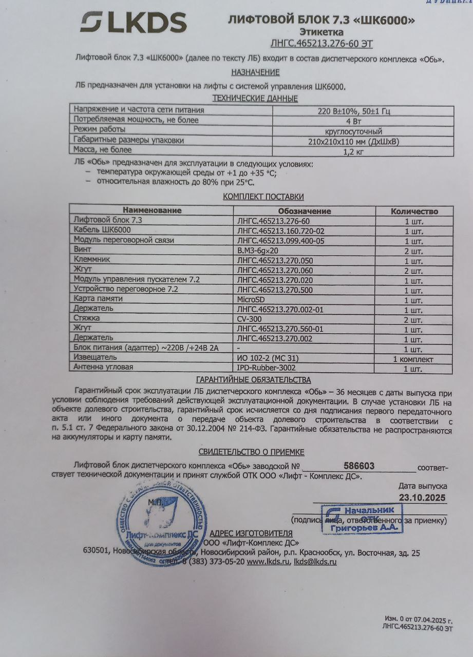 | Лифтовой блок 7.3 | ЛНГС.465213.276-60 | 1 шт. |